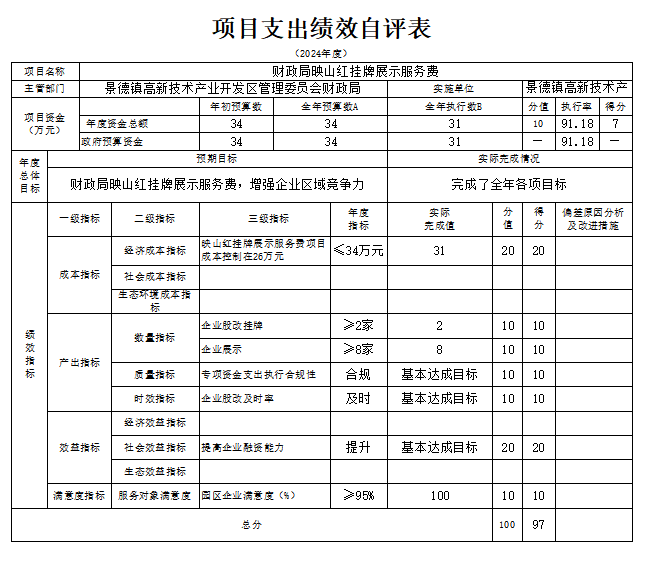 我部门积极开展2024年度部门评价工作,现将“景德企业股改挂牌交易专项补助资金”项目支出部门评价情况报告如下: