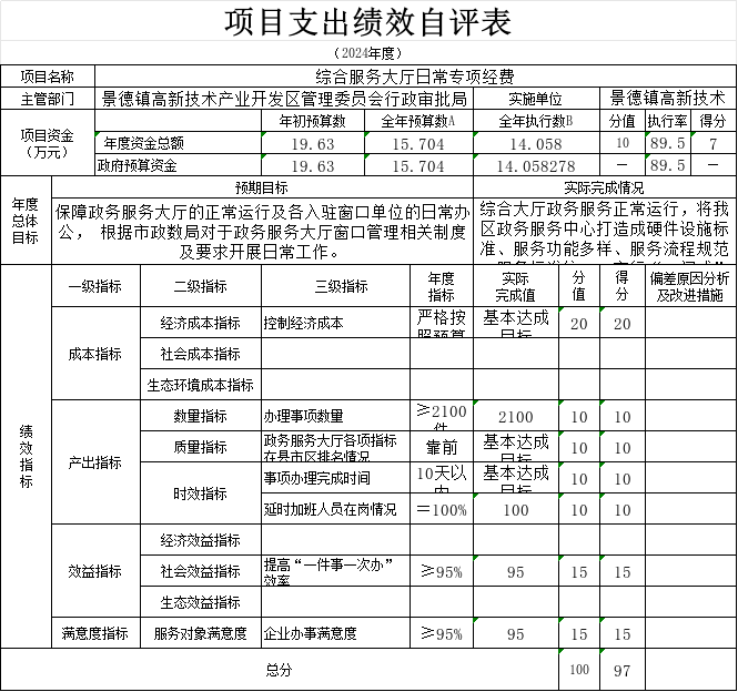 2024年度景德镇市高新区综合服务大厅日常运行专项经费,已完成相关绩效目标。经综合评定,项目绩效评价得分为97分,综合评价等级为:优。