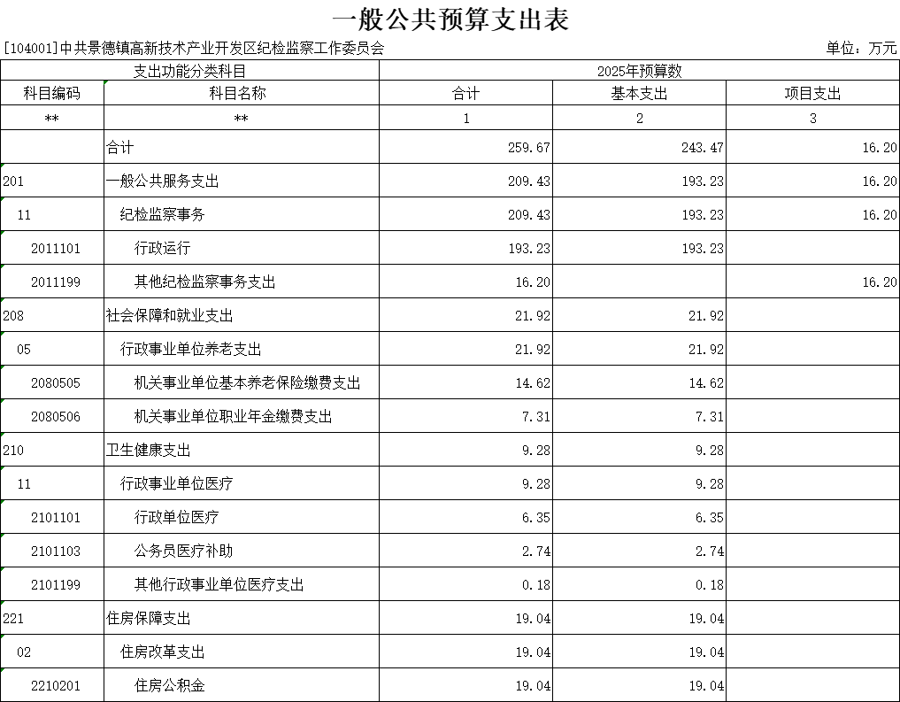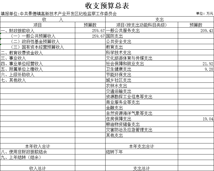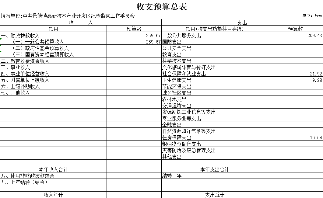 按支出功能项目科目划分:一般公共服务209.43 万元,较上年预算安排增加35.19万元;国防支出0万元,较上年预算安排增加0 万元;公共安全支出0 万元,较上年预算安排增加0万元;教育支出0 万元,较上年预算安排增加0万元;科学技术支出0 万元,较上年预算安排增加0万元;文化旅游体育与传媒支出0 万元,较上年预算安排增加0万元;社会保障和就业支出21.92 万元,较上年预算安排增加5.69万元;卫生健康支出9.28 万元,较上年预算安排增加2.41万元;节能环保支出0 万元,较上年预算安排增加0 万元;城乡社区支出0 万元,较上年预算安排增加0 万元;农林水支出0 万元,较上年预算安排增加0万元;交通运输支出0 万元,较上年预算安排增加0万元;资源勘探工业信息等支出0 万元,较上年预算安排增加0万元;商业服务业等支出0 万元,较上年预算安排增加0万元;金融支出0 万元,较上年预算安排增加0万元;自然资源海洋气象等支出0 万元,较上年预算安排增加0万元;住房保障支出19.04 万元,较上年预算安排增加4.29 万元;粮油物资储备支出0 万元,较上年预算安排增加0万元;灾害防治及应急管理支出0 万元,较上年预算安排增加0万元;其他支出0 万元,较上年预算安排增加0万元。