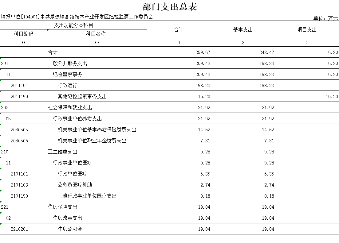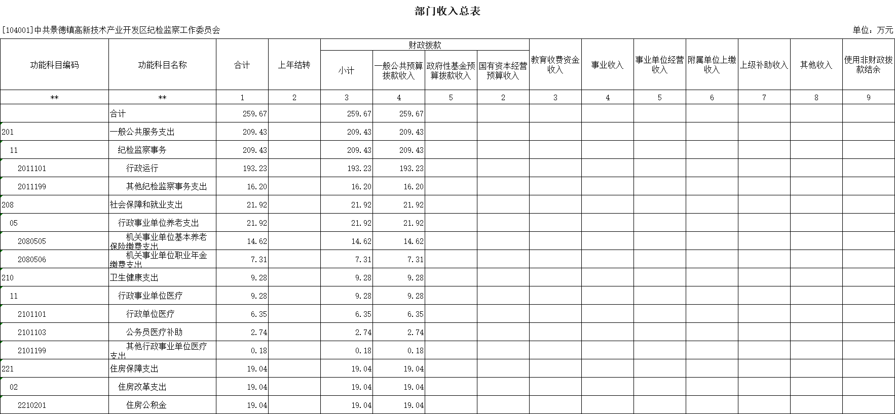 按支出功能项目科目划分:一般公共服务209.43 万元,国防支出0 万元,公共安全支出0 万元,教育支出0 万元,科学技术支出0万元,文化旅游体育与传媒支出0 万元,社会保障和就业支出21.92万元,卫生健康支出9.28 万元,节能环保支出0 万元,城乡社区支出0 万元,农林水支出0 万元,交通运输支出0 万元,资源勘探工业信息等支出0 万元,商业服务业等支出0 万元,金融支出0 万元,自然资源海洋气象等支出0 万元,住房保障支出19.04 万元,粮油物资储备支出0 万元,灾害防治及应急管理支出0 万元,其他支出0 万元。