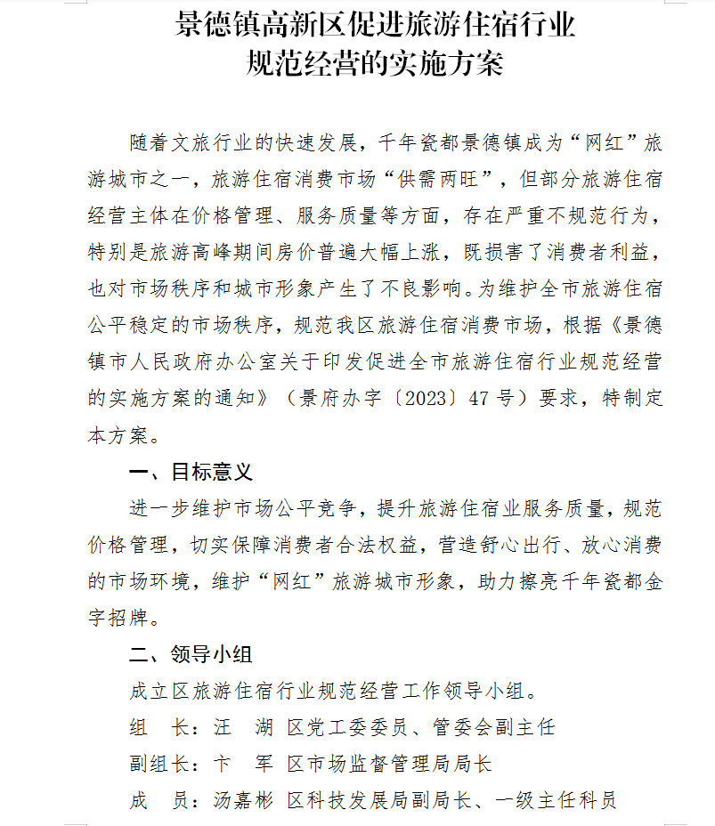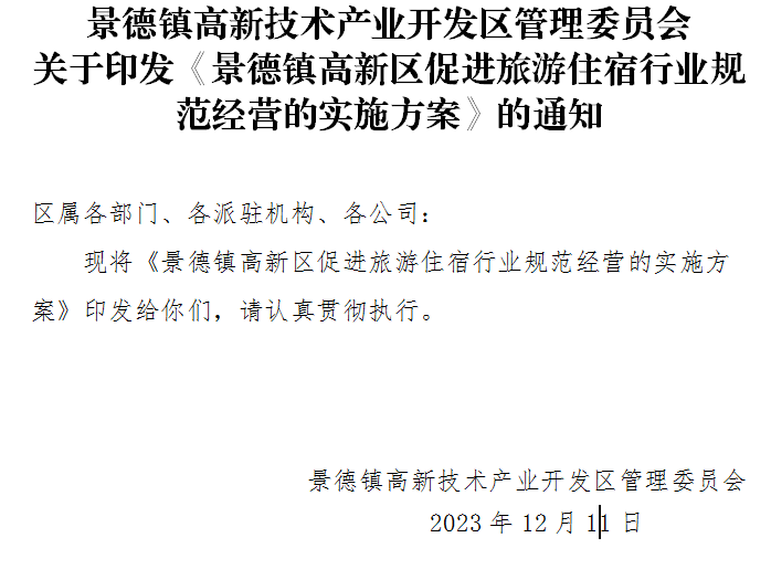 景德镇高新技术产业开发区管理委员会 关于印发《景德镇高新区促进旅游住宿行业规范经营的实施方案》的通知