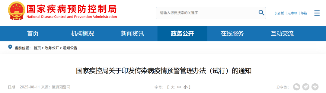 8月11日,国家疾控局发布了《关于印发传染病疫情预警管理办法(试行)的通知》。根据《传染病疫情预警管理办法(试行)》,预警情形包括法定传染病、新发传染病、原因不明的传染病以及其他重点传染病等引发或可能引发的公共卫生风险,需要提醒可能受影响人群、相关部门或机构提前采取一定的防范准备措施。
